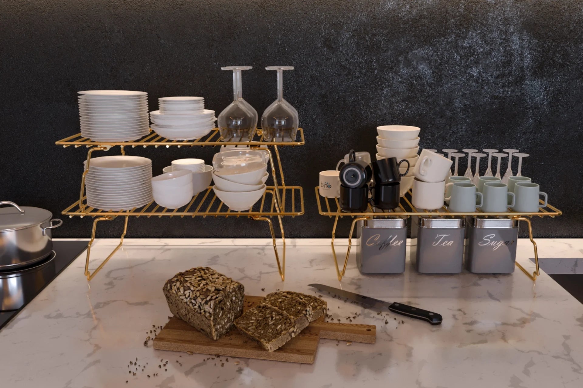 Modern & Minimalist: Altın kaplama detaylar ve ahşap dokusuyla mutfağınıza lüks bir ambiyans.