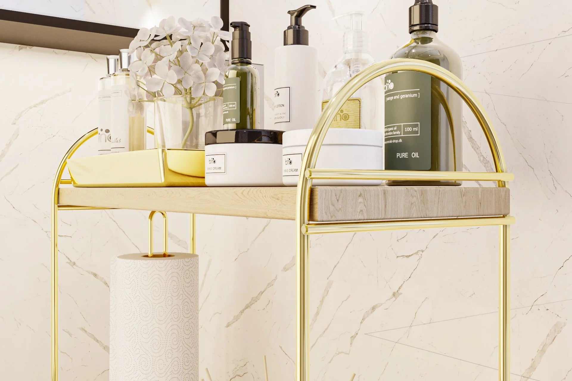 Mekanlarınıza düzen ve modernlik katın! Masif ahşap dokusu, altın kaplamalı çelik detayları ve iki katlı geniş raf tasarımıyla bu organizer, hem mutfakta hem de banyoda pratik bir çözüm sunar. Kitaplarınız, makyaj malzemeleriniz veya mutfak gereçleriniz için ideal depolama alanı!
