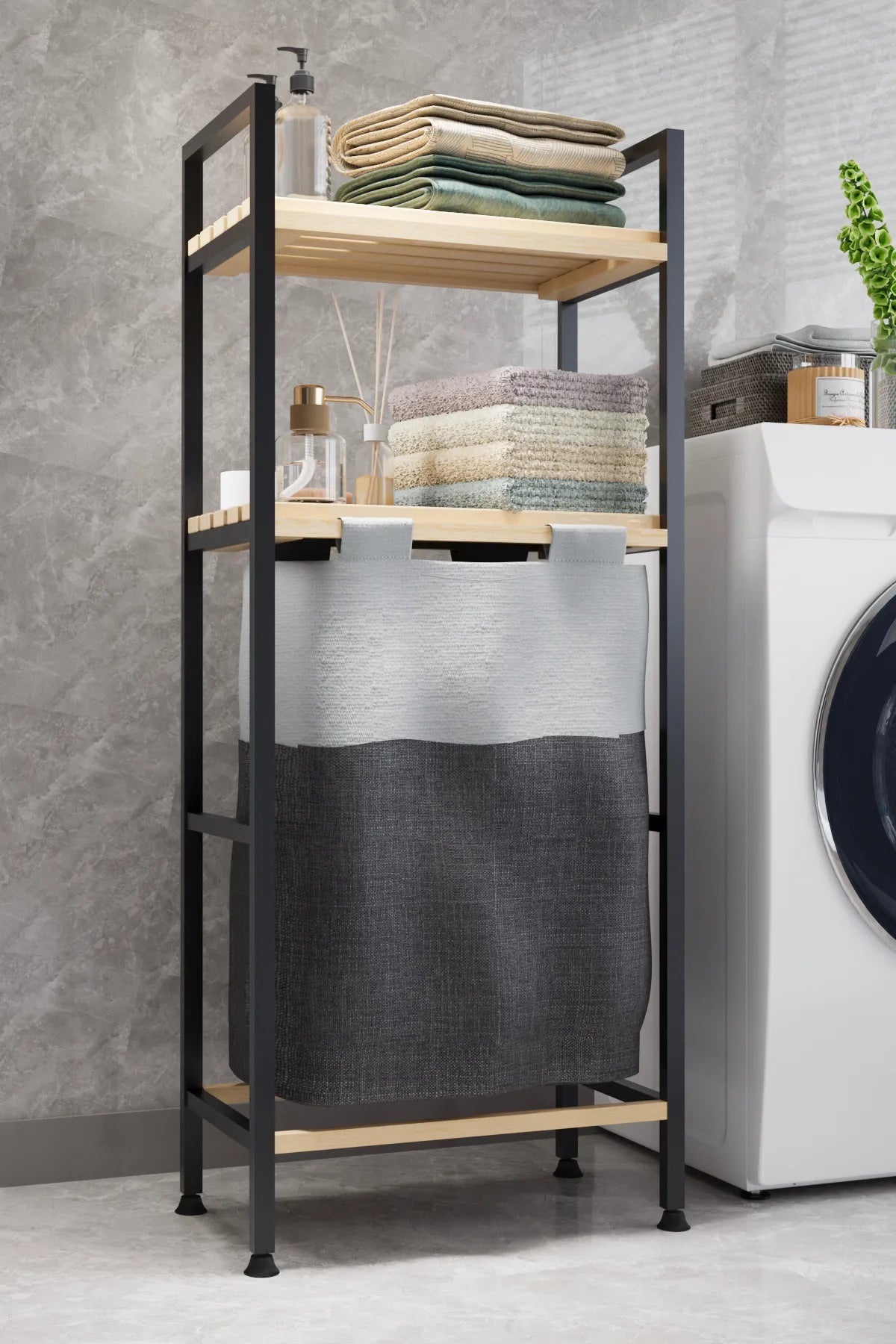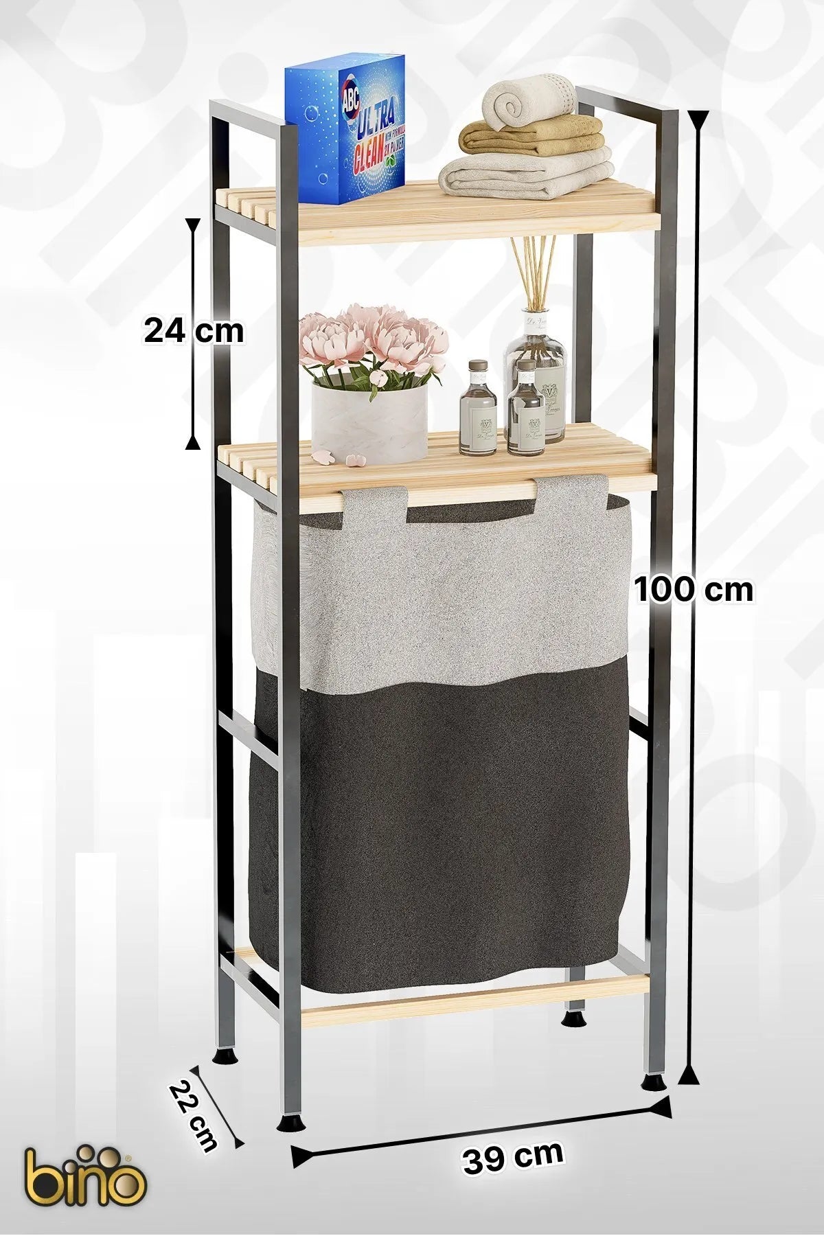 Bino Çamaşır Sepeti Ahşap Raflı Kirli Sepeti 2 Katlı Büyük Boy Kapaklı Çok Amaçlı Banyo Düzenleyici